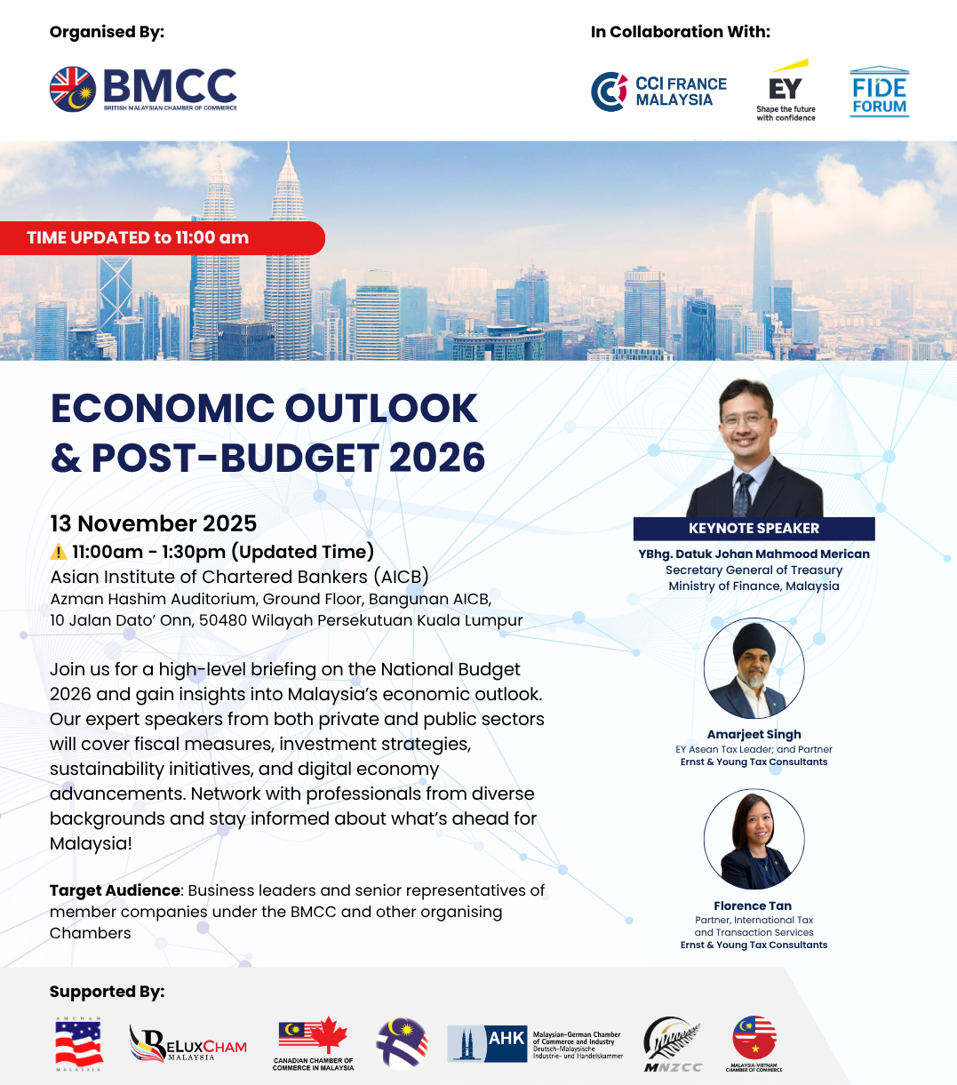 Join us for a high-level briefing on the National Budget 2026 and gain insights into Malaysia's economic outlook. Our expert speakers from both private and public sectors will cover fiscal measures, investment strategies, sustainability initiatives, and digital economy advancements. Network with professionals from diverse backgrounds and stay informed about what's ahead for Malaysia!