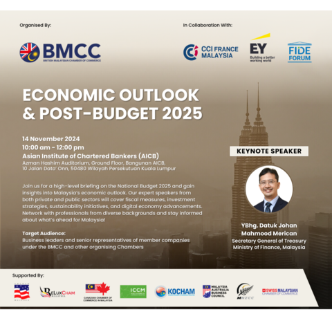 We invite you to join us for an exclusive high-level briefing on the National Budget 2025, where you will gain valuable insights into Malaysia's economic outlook. This event is tailored for business leaders and senior representatives from member companies of the British-Malaysian Chamber of Commerce (BMCC) and other organizing chambers.
