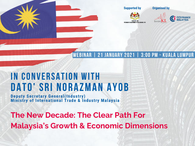 InvestKL and CCIFM with the support of MITI will be organizing an exclusive webinar with Dato' Sri Norazman Ayob, Deputy Secretary-General (Industry) at the Ministry of International Trade & Industry Malaysia for a better understanding on the Malaysian economic outlook.