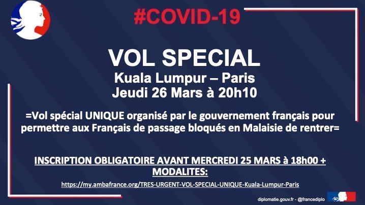 Etant donné l’annulation de la plupart des vols vers l’Europe, les escales désormais impossibles dans de nombreux pays, le possible arrêt complet de toute desserte aérienne d’ici quelques jours, et le risque de prolongation de la période de confinement général en Malaisie très au-delà du 31 mars, nous incitons fortement les Français bloqués en Malaisie et qui souhaitent retourner en France à embarquer sur ce vol, qui sera le seul organisé par le gouvernement français.